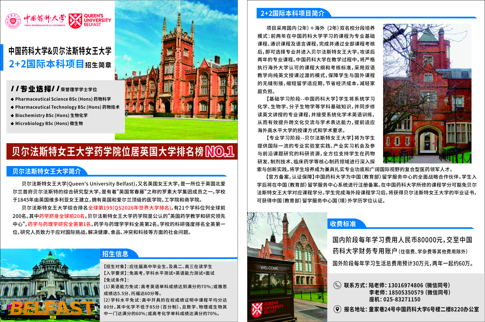 【无缝衔接,高效过渡】前两年在中国药科大学学习的课程为专业基础课程、通识课程及语言课程,完成并通过全部课程考核后,即可选择专业并进入海外大学,攻读后两年的专业课程。中国药科大学在教学过程中,将严格执行海外大学认可的课程大纲和考核标准,采用双语教学向纯英文授课过渡的模式,保障学生与国外课程的无缝衔接,缩短留学适应期,节省经济成本,减轻家庭负担。